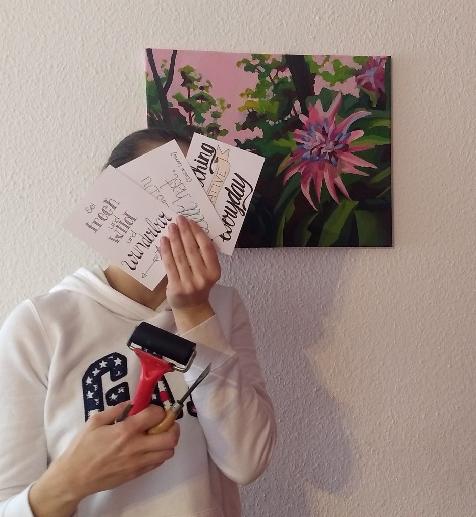 Meine große Leidenschaft ist die Kunst. Am liebsten gestalte ich Linolschnitte in unterschiedlichen Farben. Seit einiger Zeit habe ich auch das sogenannte Handlettering für mich entdeckt und kreiere bunte Postkarten und Schriftzüge. Der ein oder andere meiner Schüler ist bestimmt schon einer meiner handgeschriebenen Überschriften begegnet. Die Pausen zwischen Schule und Kunst nutze ich für gutes, selbstgekochtes Essen und entspannte Filmabende auf der Couch.