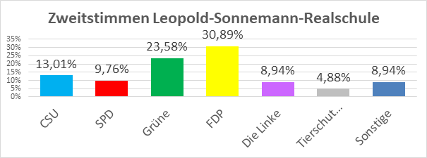 An der Leopold-Sonnemann hat es bei der Juniorwahl einen klaren Gewinner gegeben: Die FDP. Mit 28,46 % der Erststimmen schob sich die FDP knapp vor CSU und Grüne (beide jeweils 26,02 %) und hätte somit den Wahlkreis 251 Würzburg gewonnen. Damit hätte Paul Lehrieder sein Direktmandat nach vier Wahlperioden zugunsten von Herrn Ullmann verloren. Doch nicht nur bei der Erststimme schien die FDP die Jugendlichen zu überzeugen. Auch bei der Zweitstimme errangen die Liberalen die meisten Stimmen. Mit Themen wie Stärkung der Freiheitsrechte und Digitalisierung – gepaart mit einem die Jugendlichen ansprechenden Wahlkampf – konnte die FDP anscheinend sehr gut punkten. Dass auch ökologische Themen bei den Schülern:innen hoch im Kurs standen, zeigte sich an der hohen Zustimmung für die Grünen, aber auch an der Tierschutzpartei, die mit 4,88 % der Stimmen nur knapp den Einzug in den Bundestag verpasst hätte. Abgeschlagen waren hingegen die „Volksparteien“ CSU und SPD.