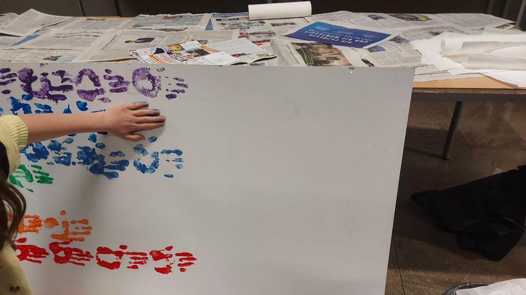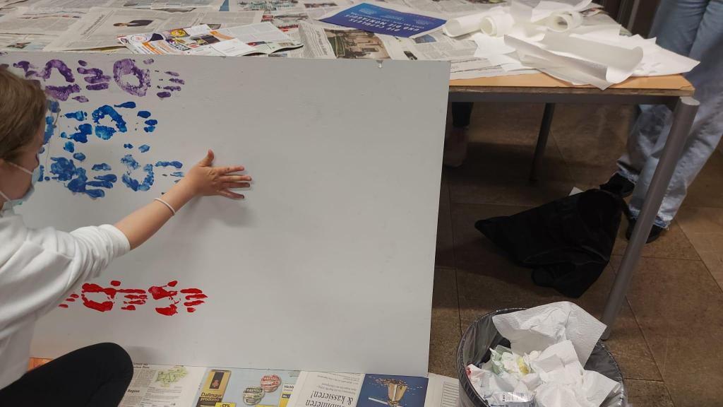 Kurz vor den Osterferien ging es – im wahrsten Sinne des Wortes – ganz schön bunt an unserer Schule zu. In der Aula hatte Frau Gärtner eine große Leinwand vorbereitet, auf der sich jede*r Schüler*in mit einem Handabdruck in einer bunten Farbe verewigen konnte.