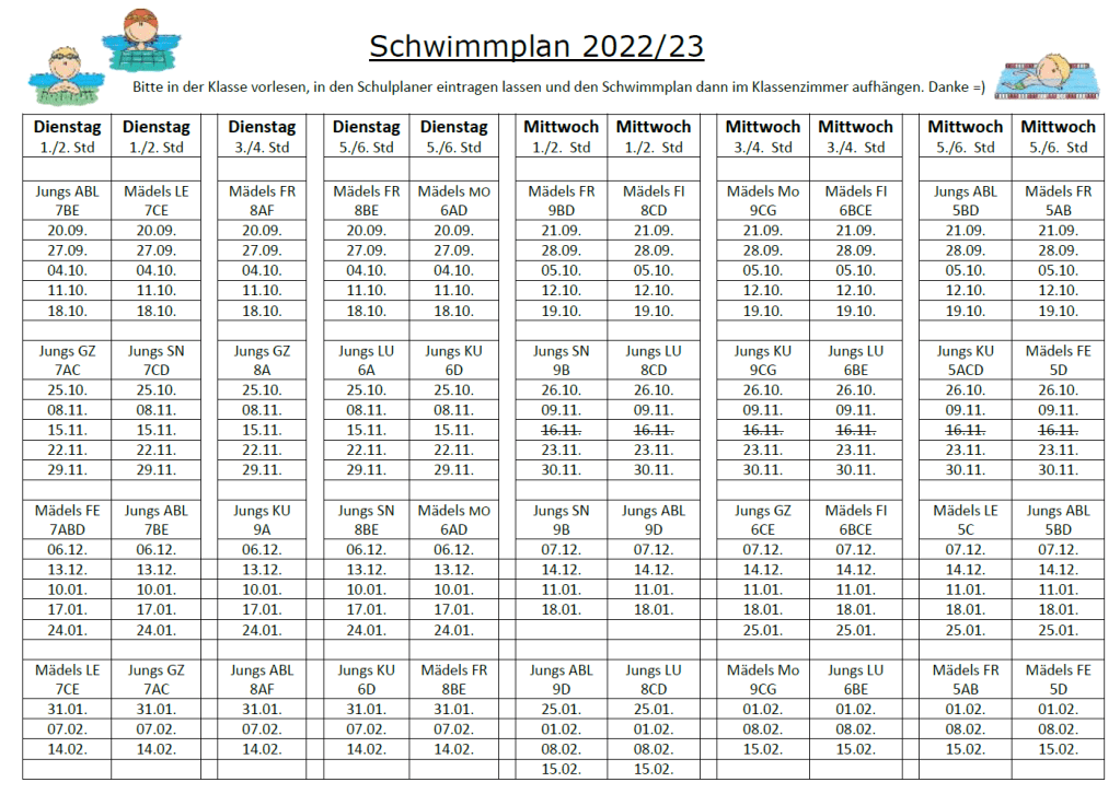 Schwimmplan 2022/23 1. Halbjahr Diesem Plan könnt ihr entnehmen, wann eure Klasse Schwimmen hat: Bitte nicht die Badehose vergessen! 🙂 Ähnliche Beiträge Kommentare sind geschlossen.