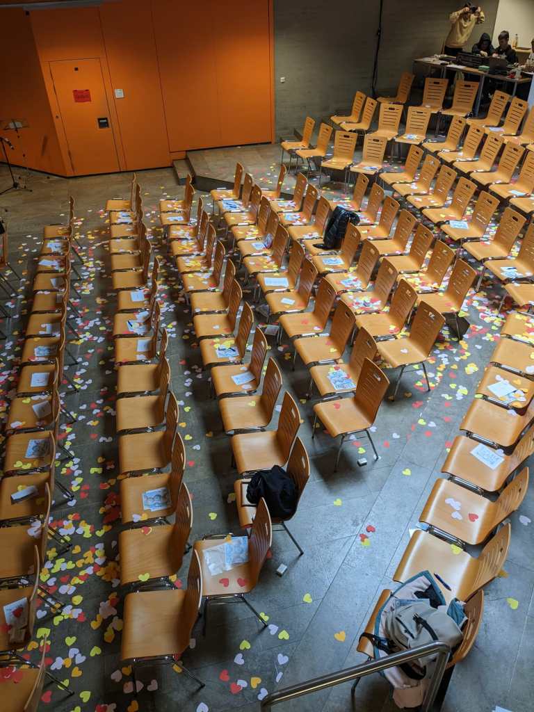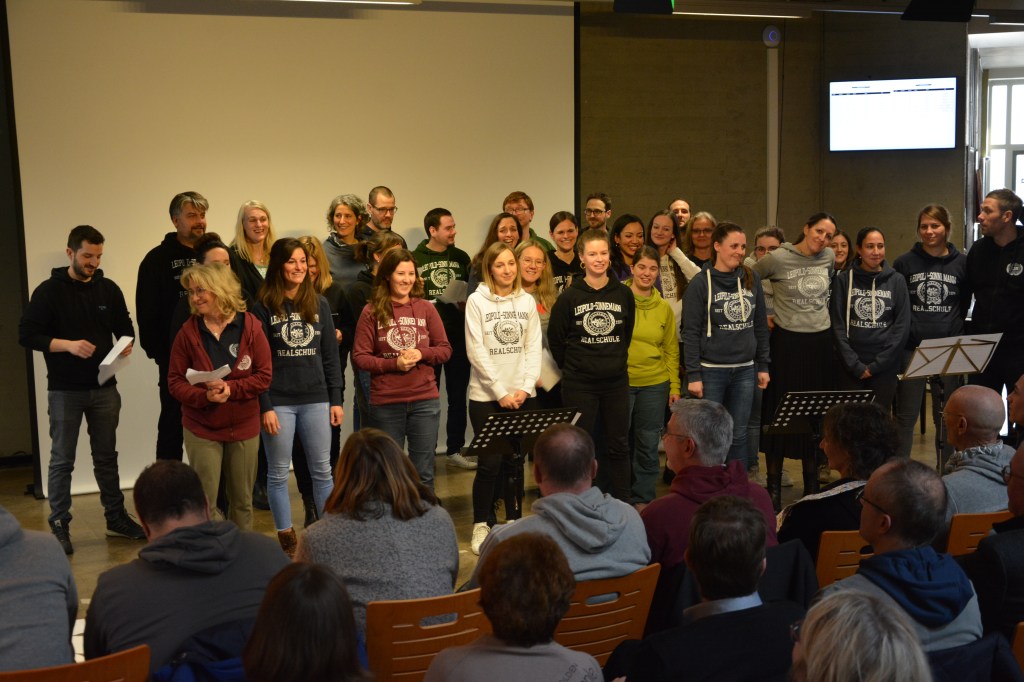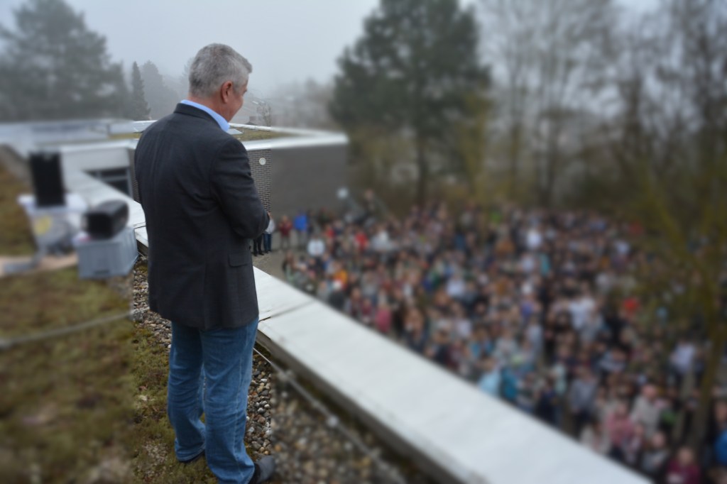 Bereits am Vormittag überraschte die Fachschaft Sport mit der gesamten Schülerschaft Herrn Ramsteiner mit einem Flashmob im Pausenhof – über 900 Schülerinnen und Schüler tanzten für ihren Schulleiter! Landrat Thomas Eberth und Höchbergs Bürgermeister Alexander Knahn unterstrichen in ihren Grußworten die Hartnäckigkeit von Herrn Ramsteiner bei Verhandlungen mit der Politik, die aber auch stets mit großer Umsicht geführt und von einem konsequenten Miteinander geprägt waren. Dass das Thema „Aus dem Rahmen gefallen“ dabei von allen Gästen mit umgesetzt wurde und wirklich alle – auch die Ehrengäste aus der Politik – mit einem Hoodie teilnahmen, vollendete die gelungene und würdige Festveranstaltung.